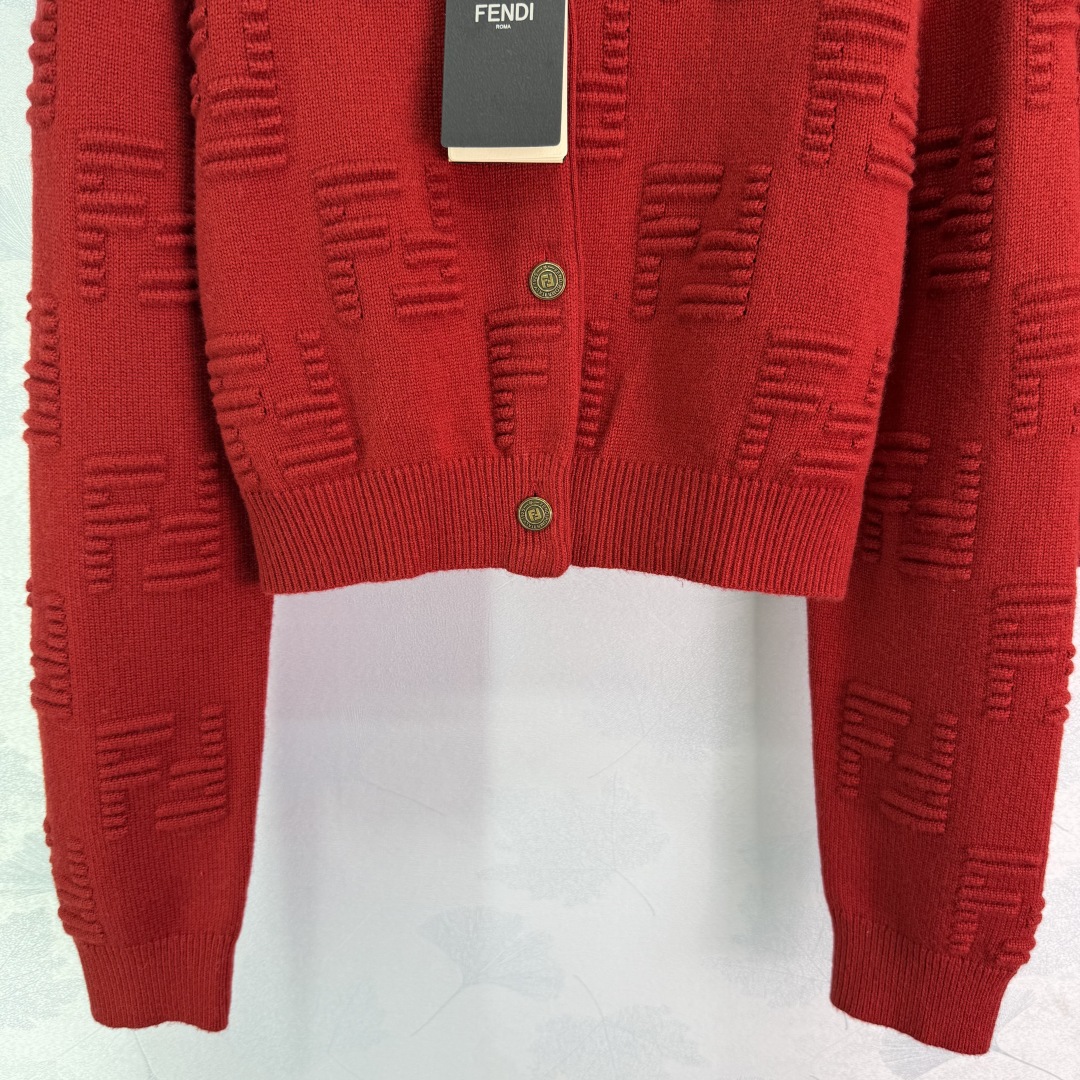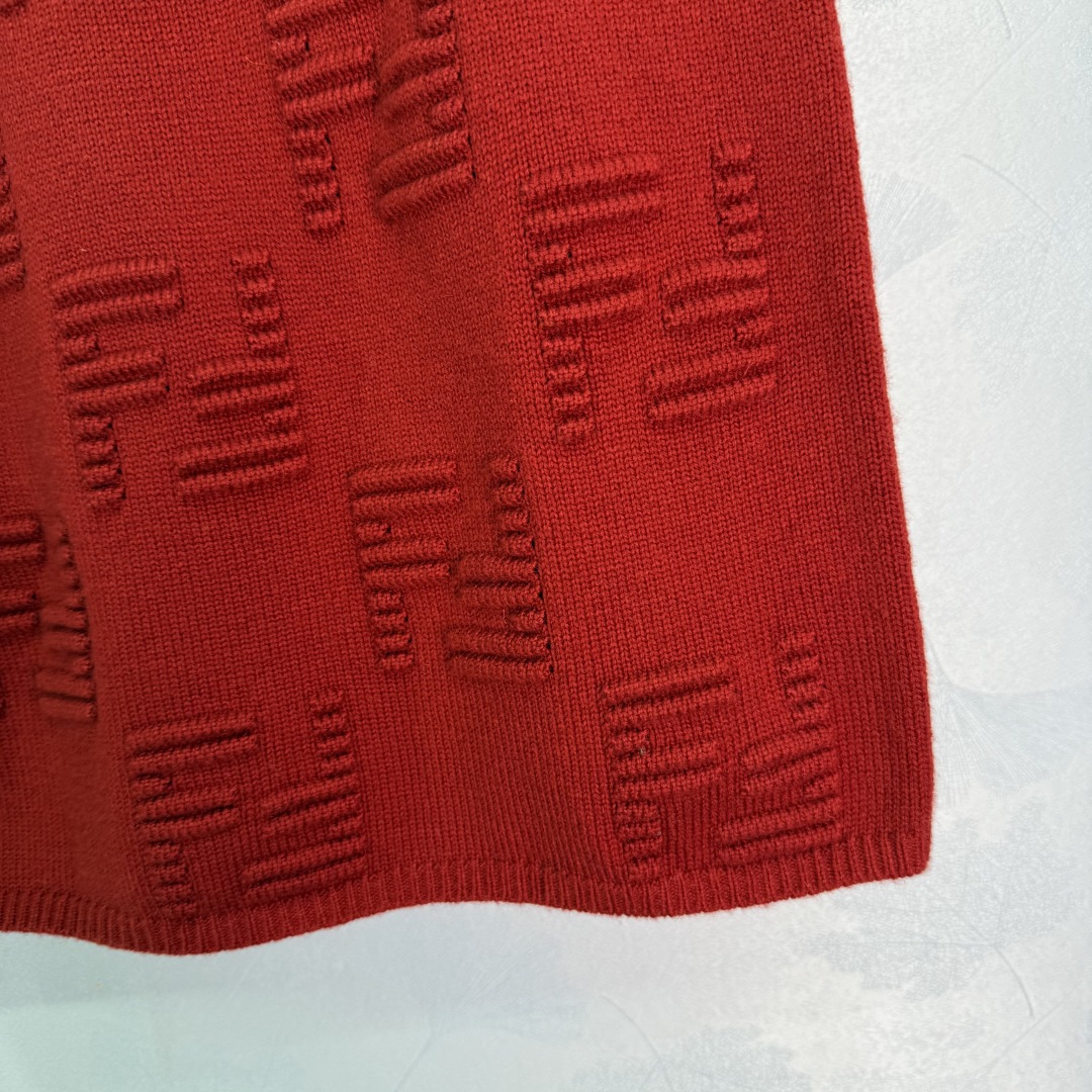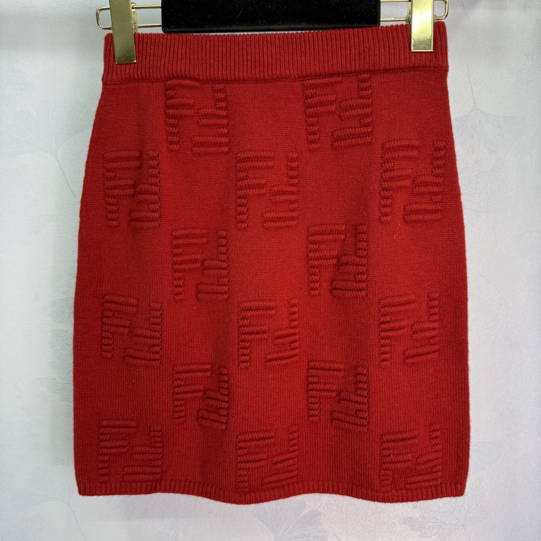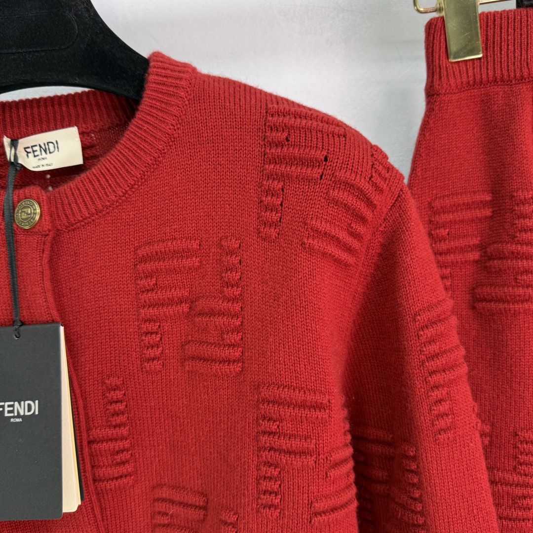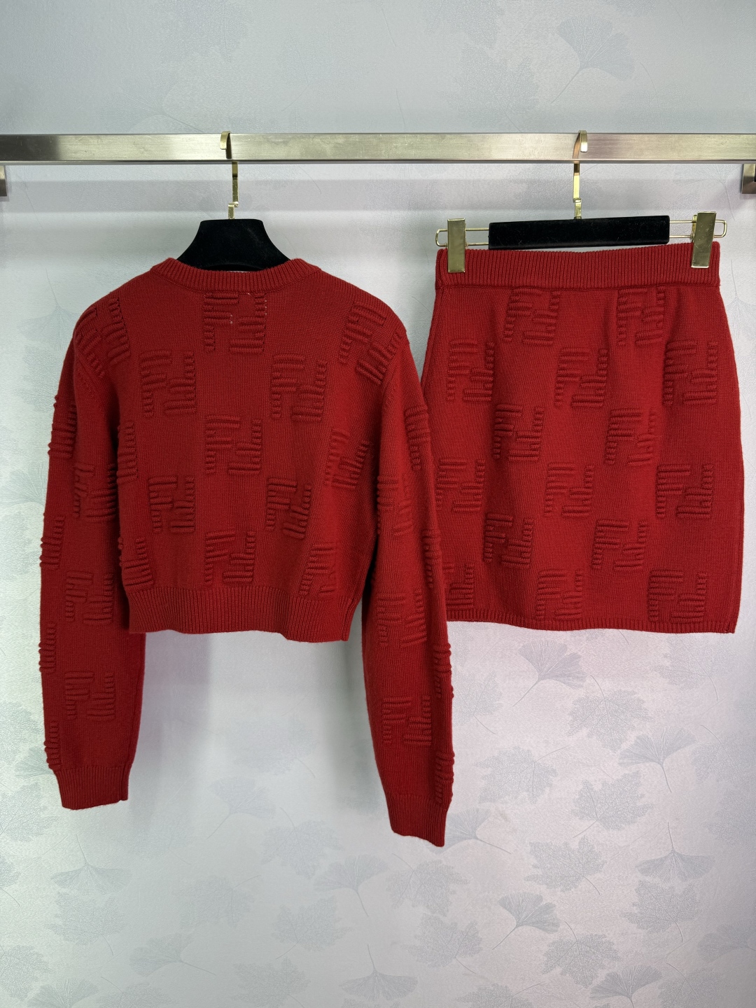 Tags: Designer Knitwear, Fall Winter Knit Outfit, Fendi Knit Set, FF Embossed Skirt, Luxury Women's Set, Red Knit Cardigan