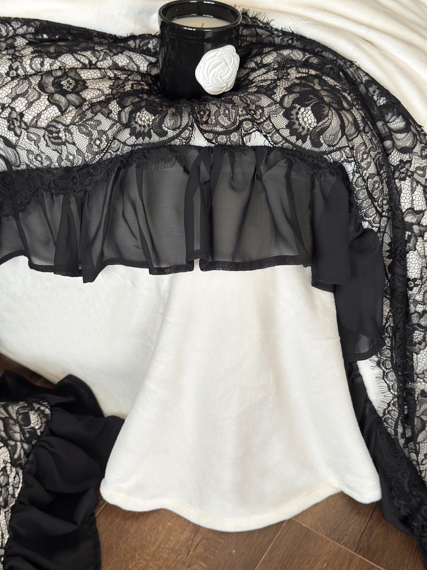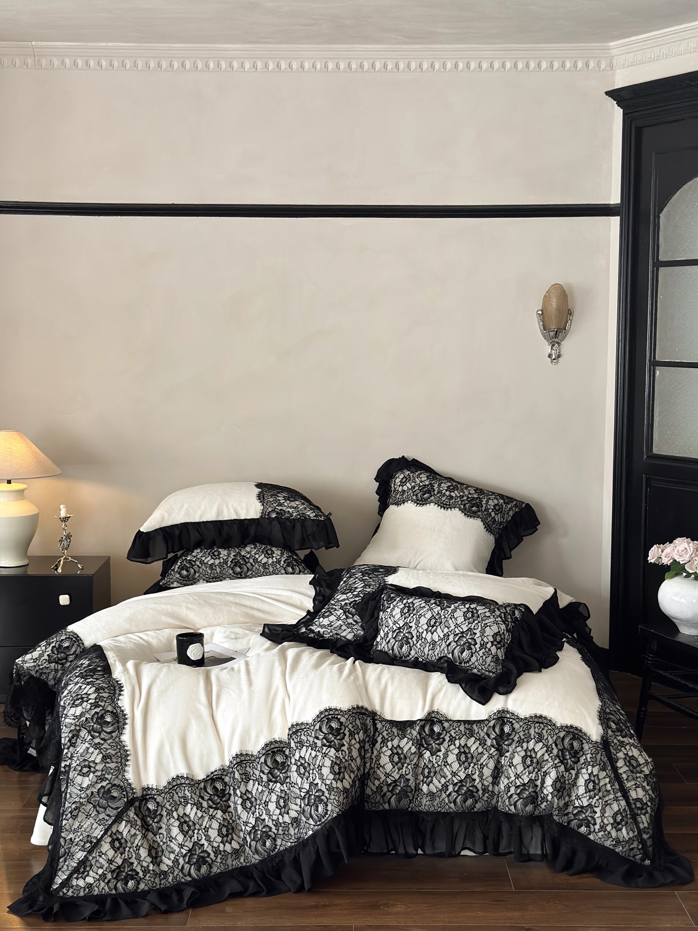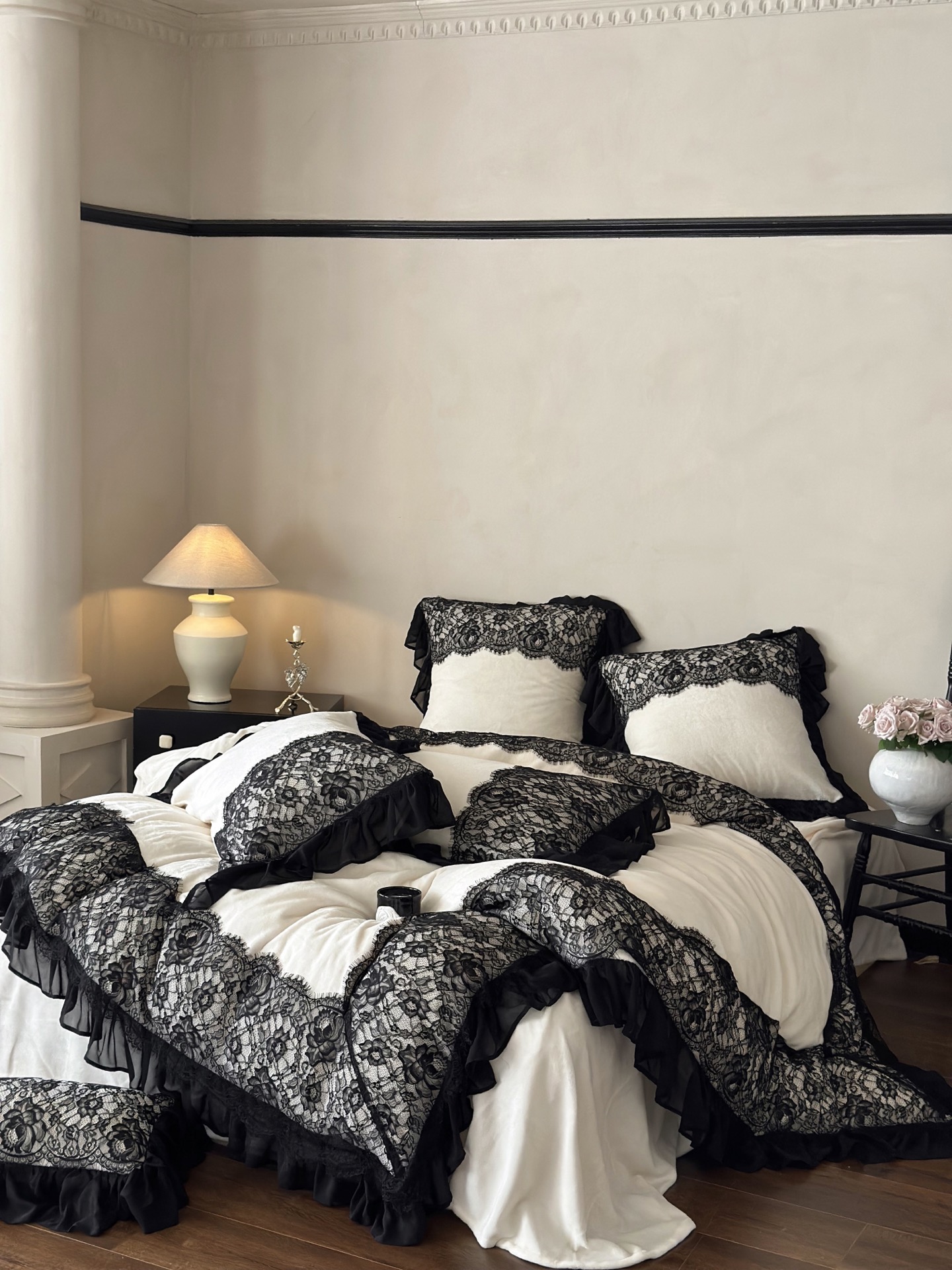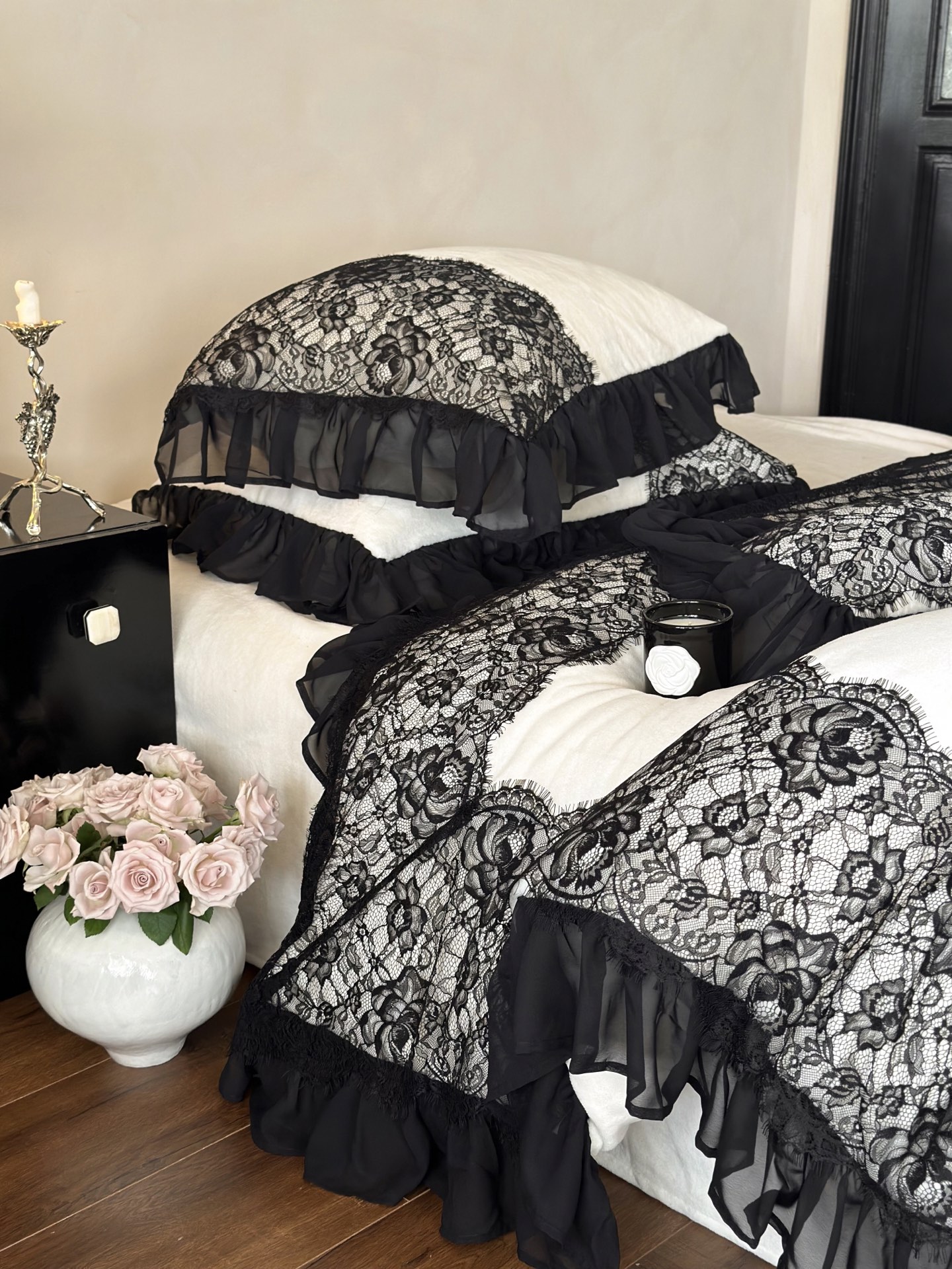 استمتع بنوم هانئ ومريح مع طقم أغطية السرير الدانتيل الفاخر. أضف لمسة من الأناقة والرقي إلى غرفة نومك واجعل كل ليلة تجربة لا تُنسى.