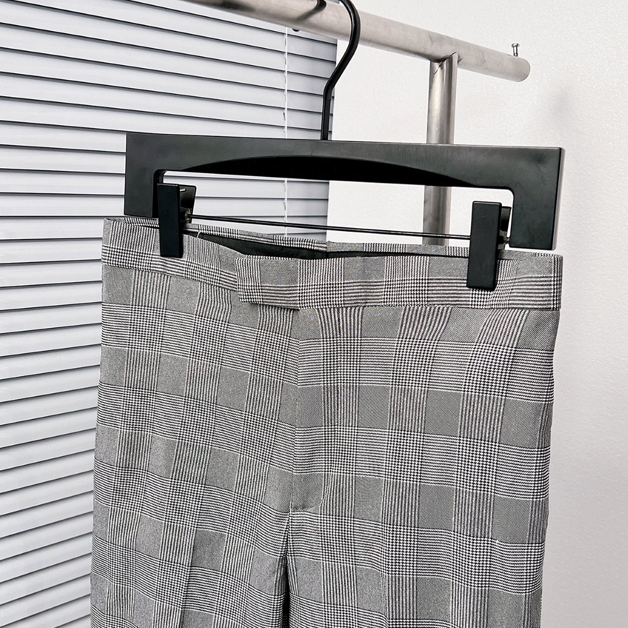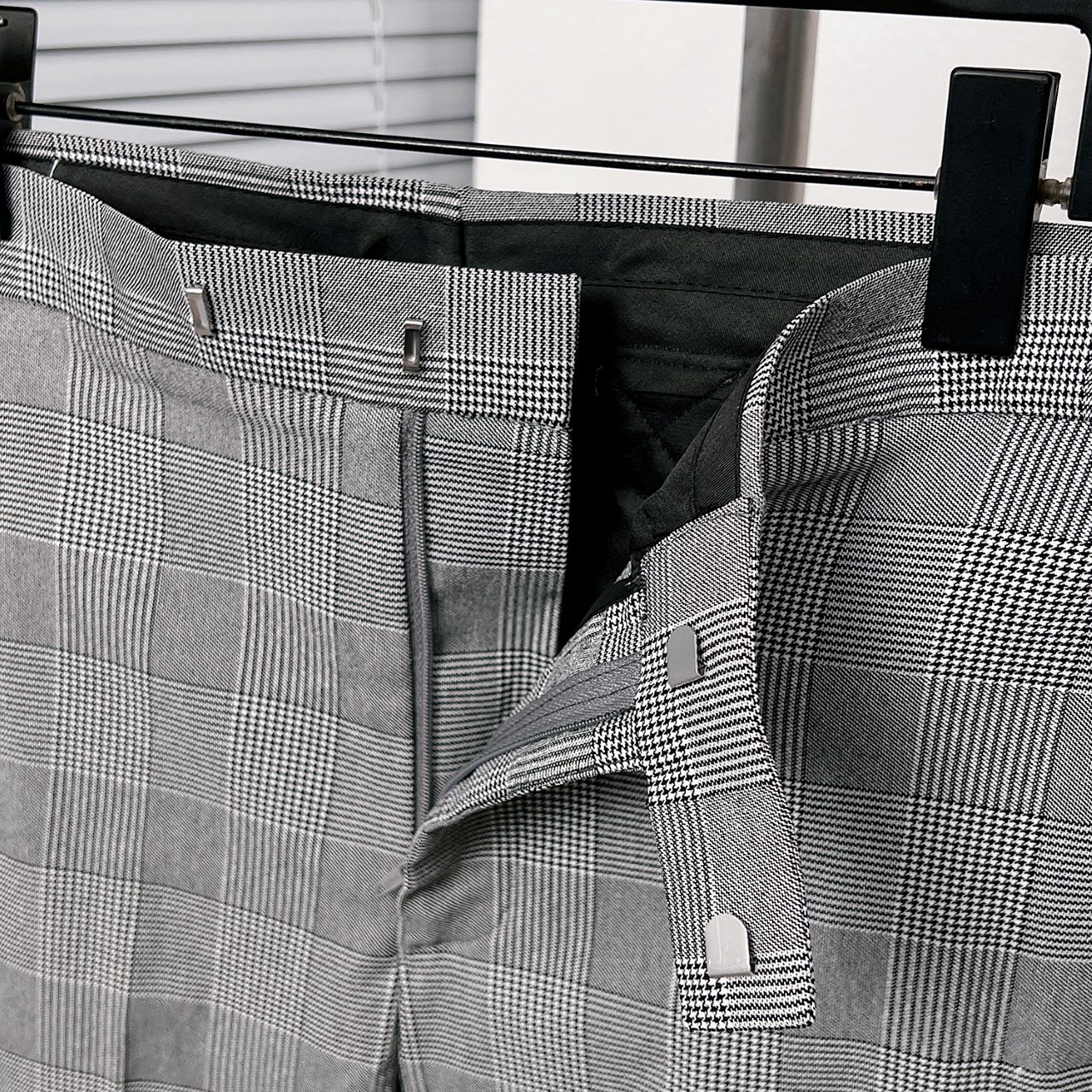 بنطلون بدلة رجالي من Thom Browne بنقشة مربعات باللون الرمادي، مثالي للمناسبات الرسمية والاجتماعات.