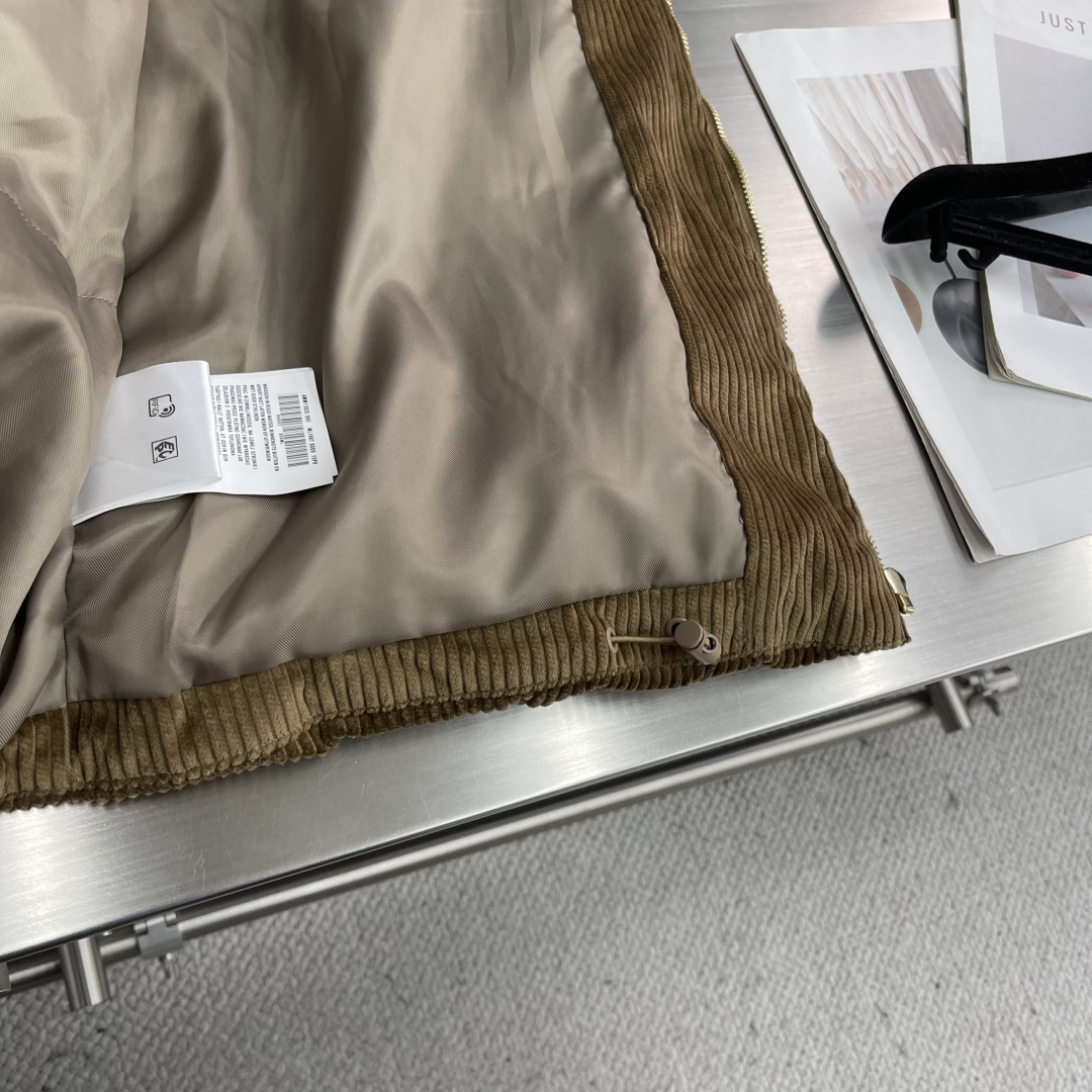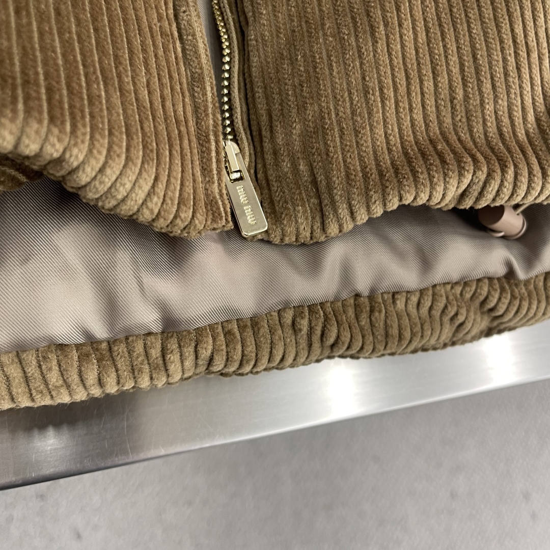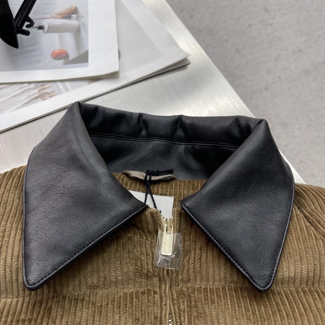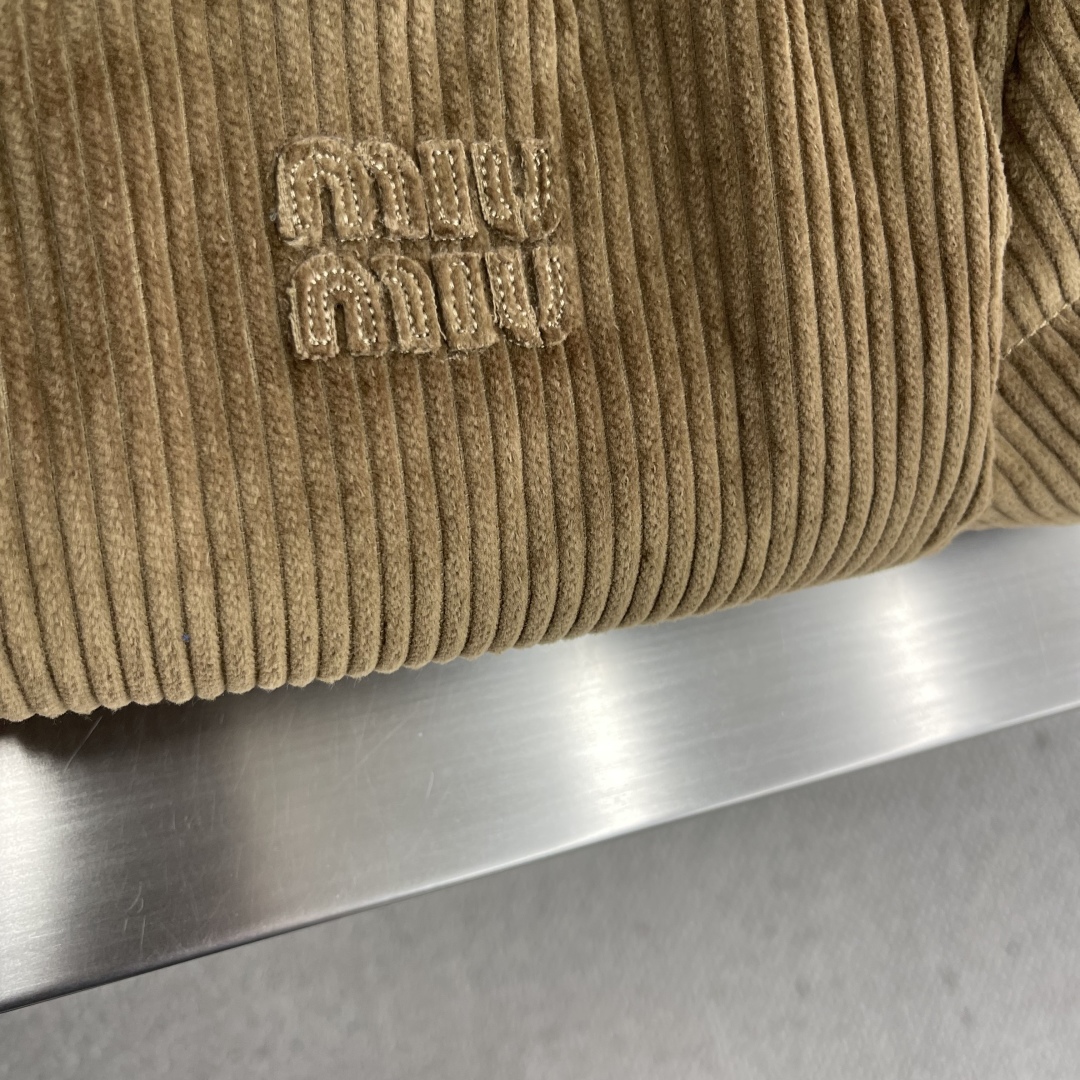 جاكيت ميو ميو 25FW الجديد. يتميز بملمس فريد من كوردروي وياقة من جلد نابا. شعار مطرز بنفس اللون يبرز أسلوبه.
