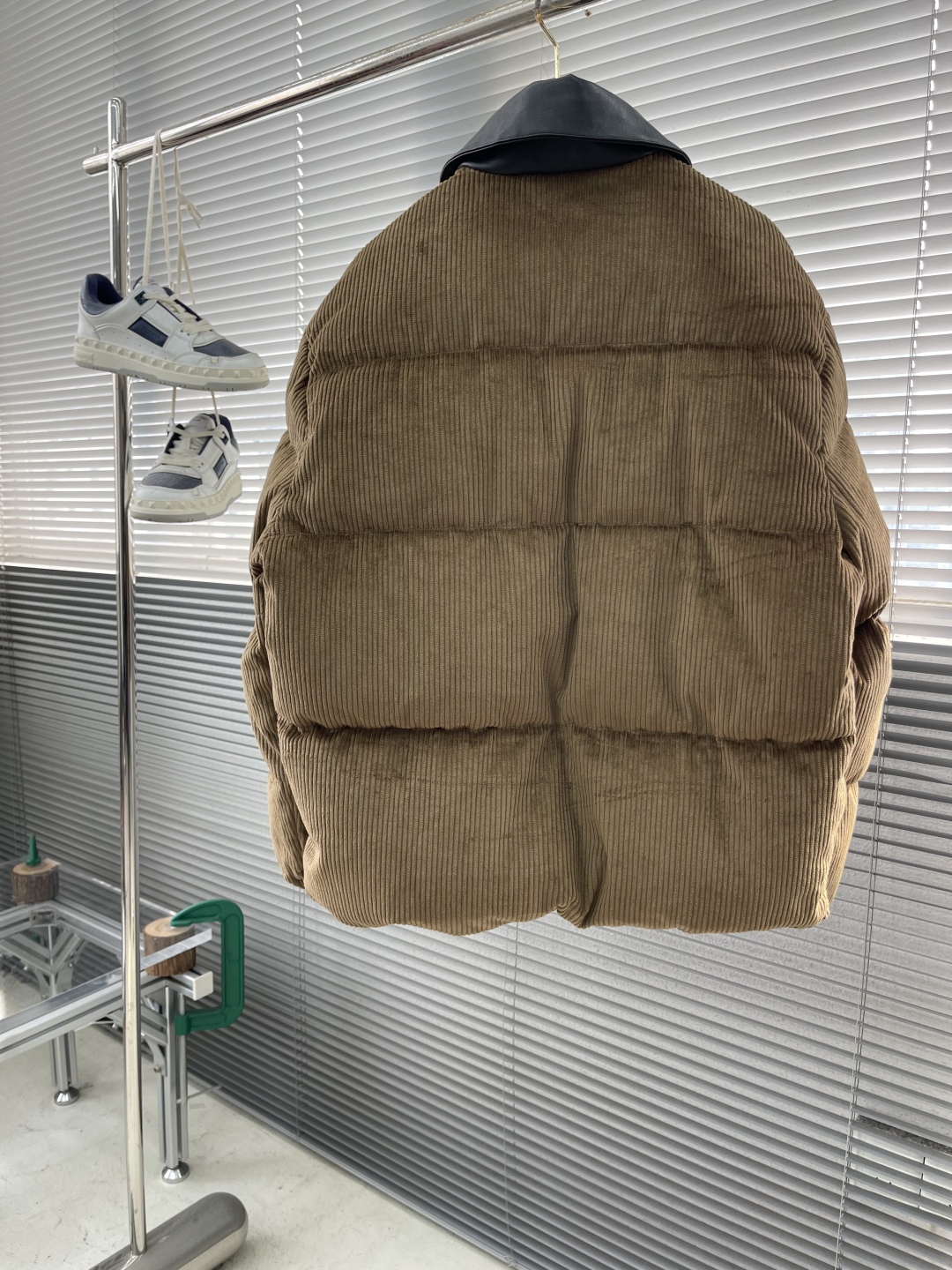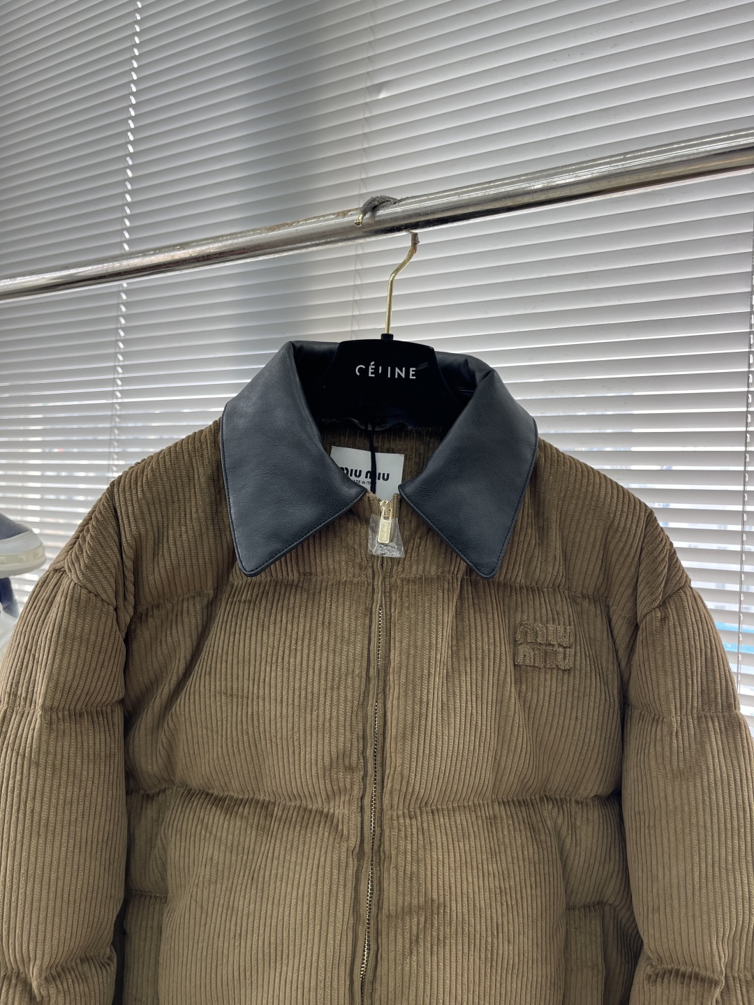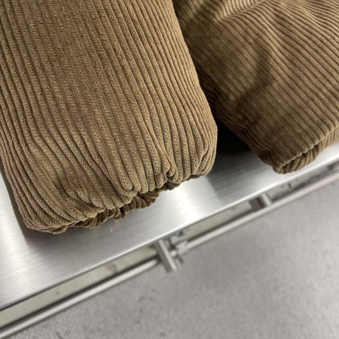 جاكيت ميو ميو 25FW الجديد. يتميز بملمس فريد من كوردروي وياقة من جلد نابا. شعار مطرز بنفس اللون يبرز أسلوبه.