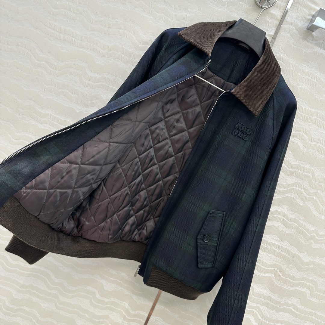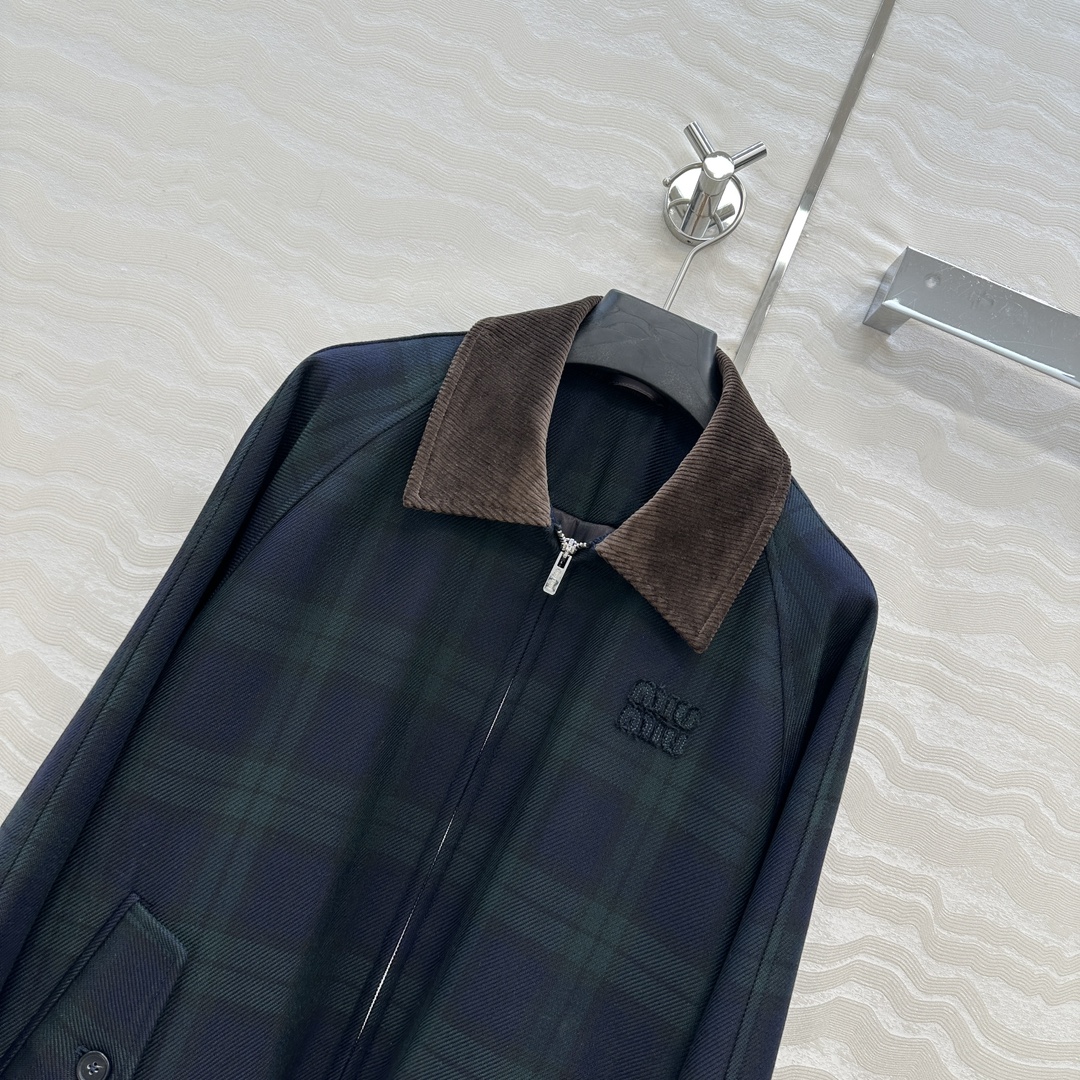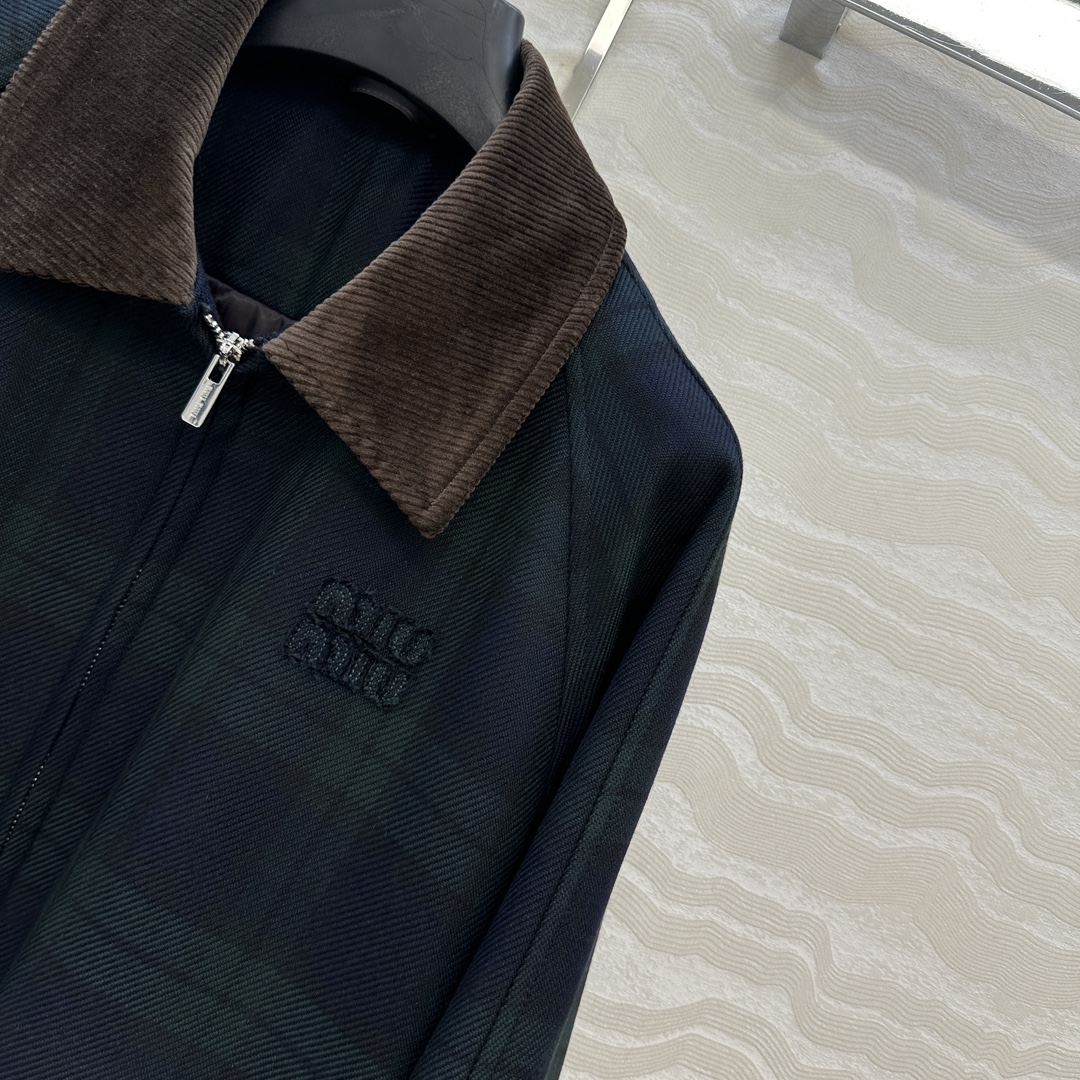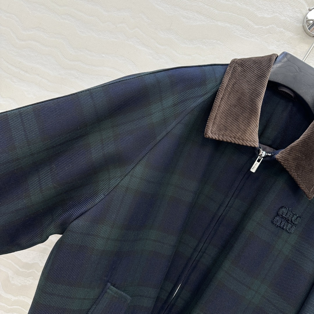 جاكيت أنيق من Miu Miu، تصميم كاروهات كلاسيكي، وياقة مخملية أنيقة، مثالي لإطلالة عصرية ومريحة.