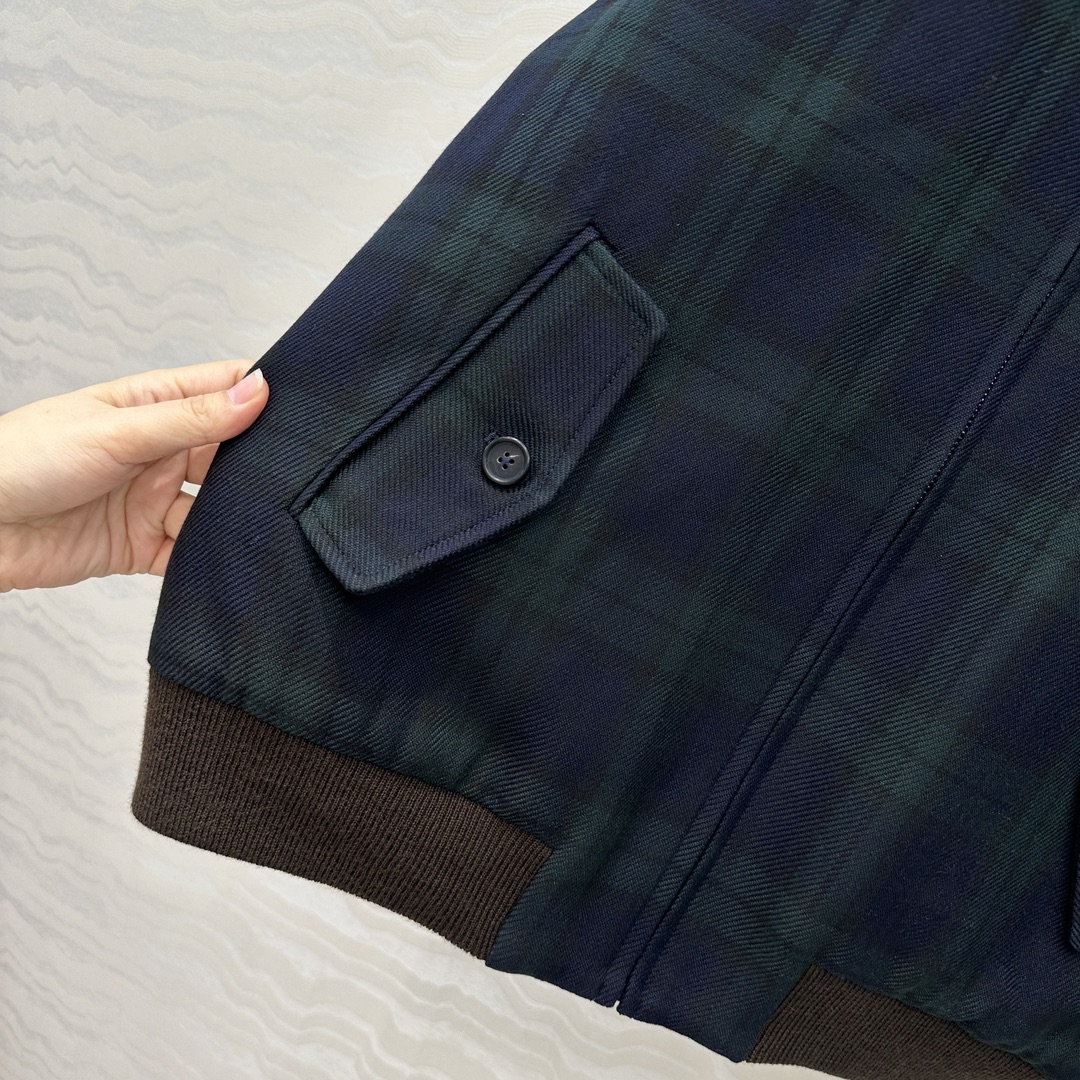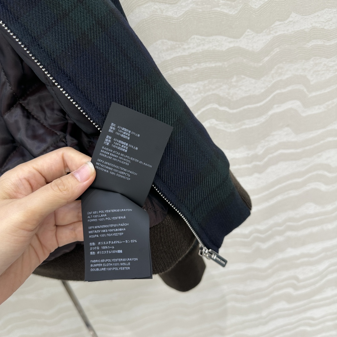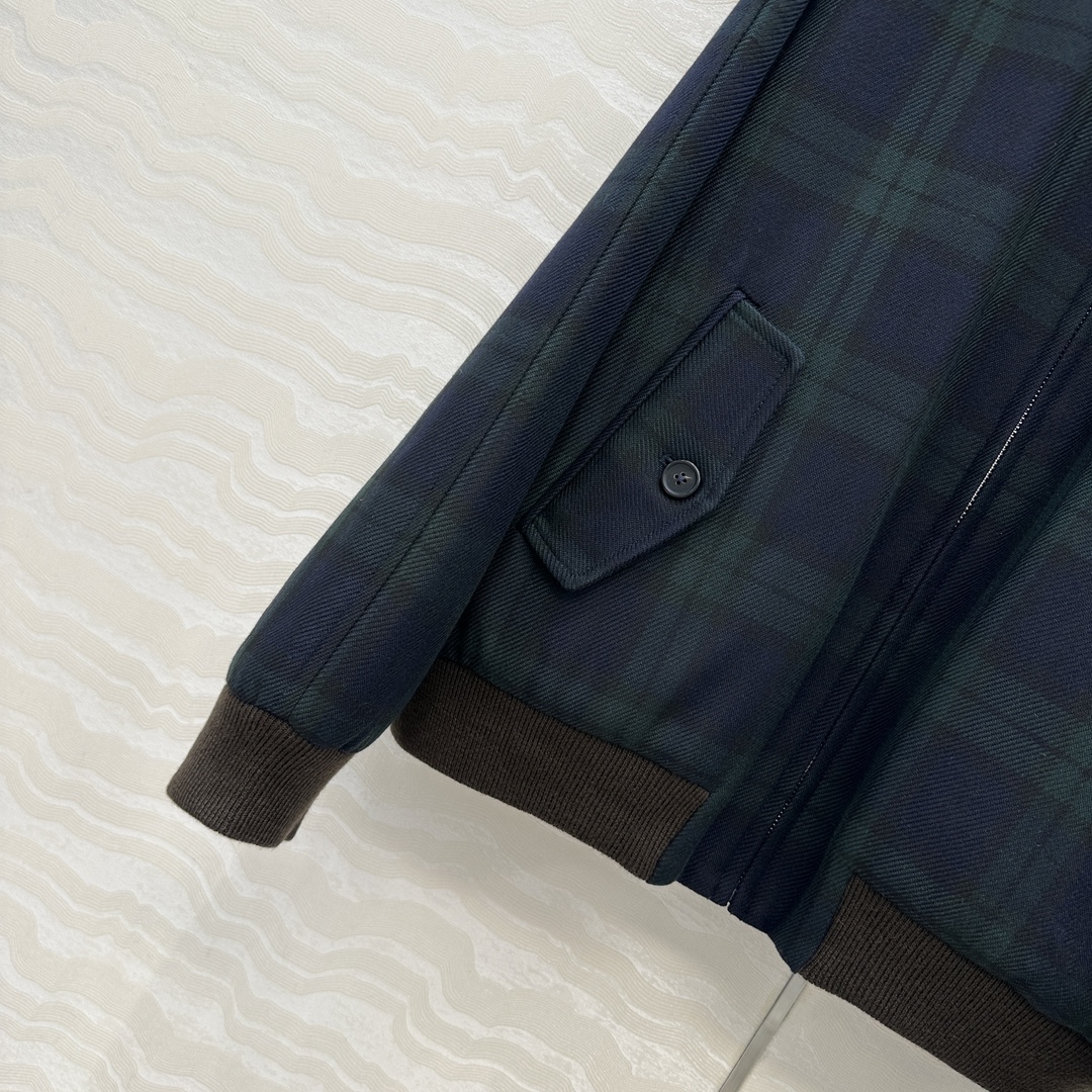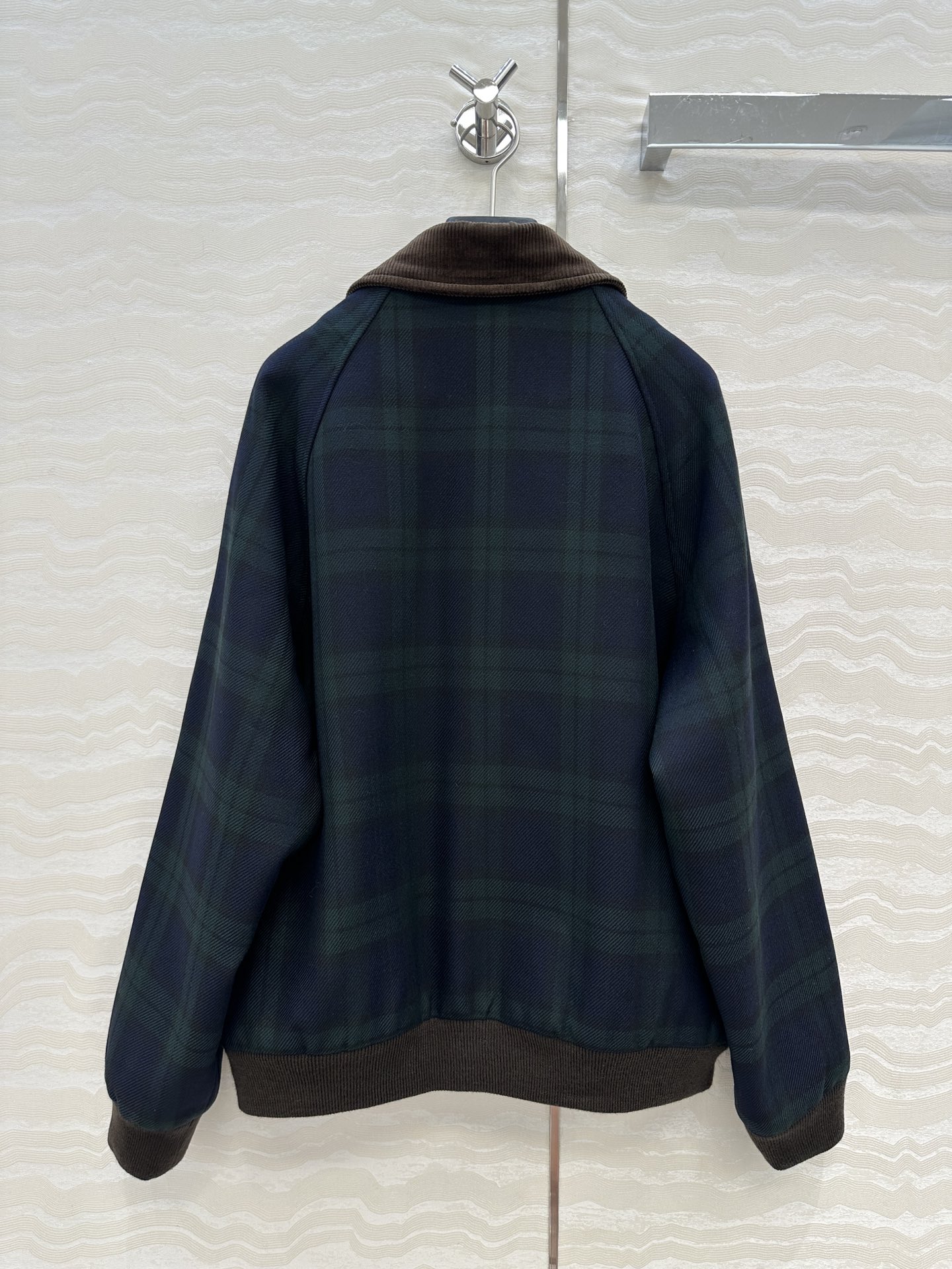 جاكيت أنيق من Miu Miu، تصميم كاروهات كلاسيكي، وياقة مخملية أنيقة، مثالي لإطلالة عصرية ومريحة.