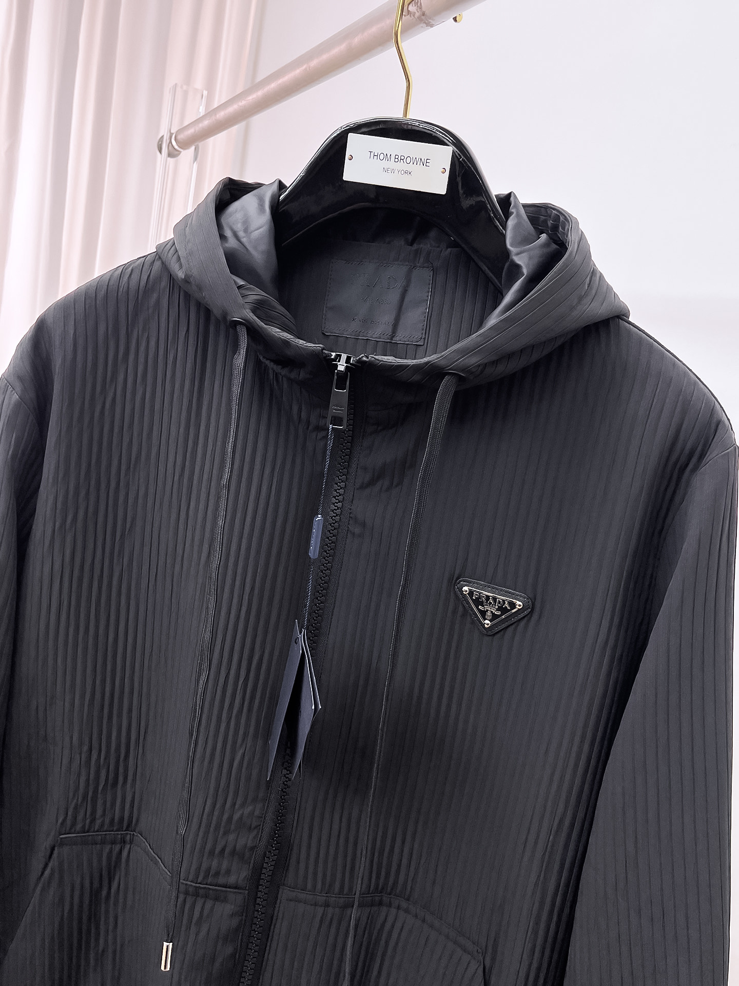 جاكيت Prada رجالي أسود عصري بغطاء للرأس. تصميم بسحاب كامل وشعار مثلث معدني. مثالي لخريف وشتاء 2025. متوفر بمقاسات M-3XL.