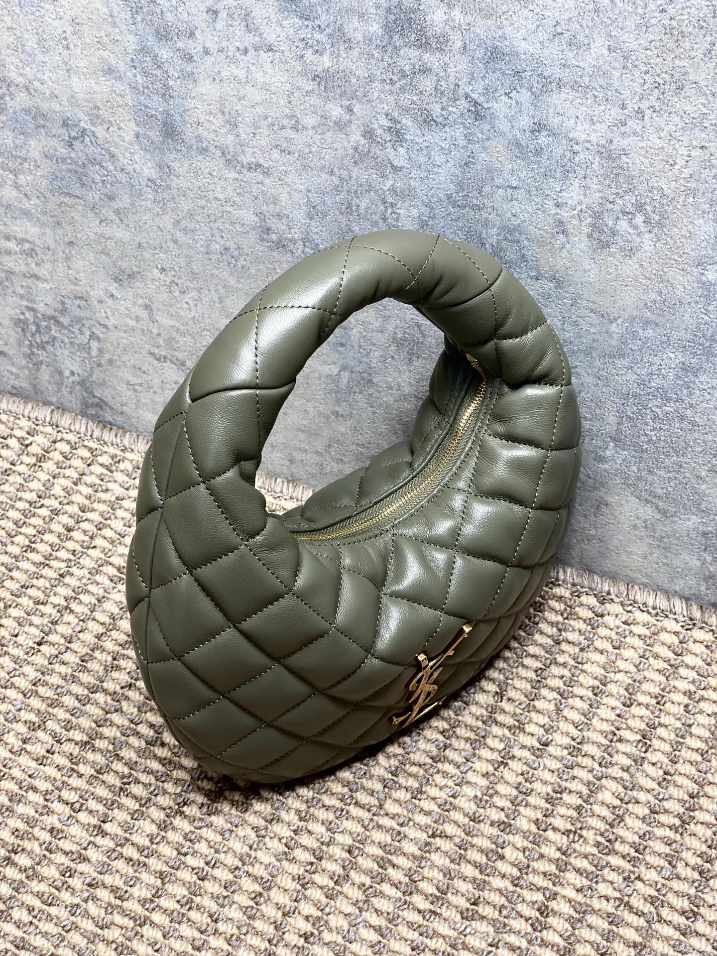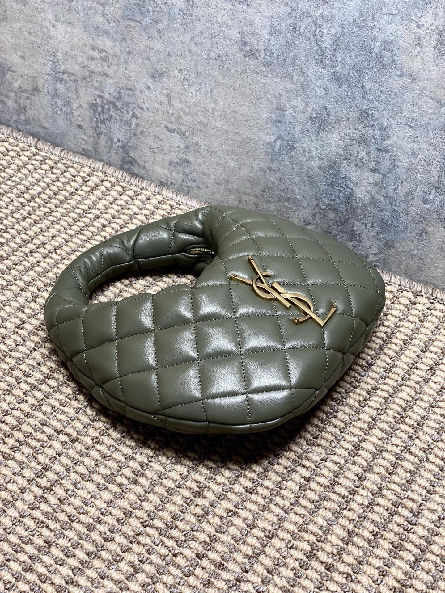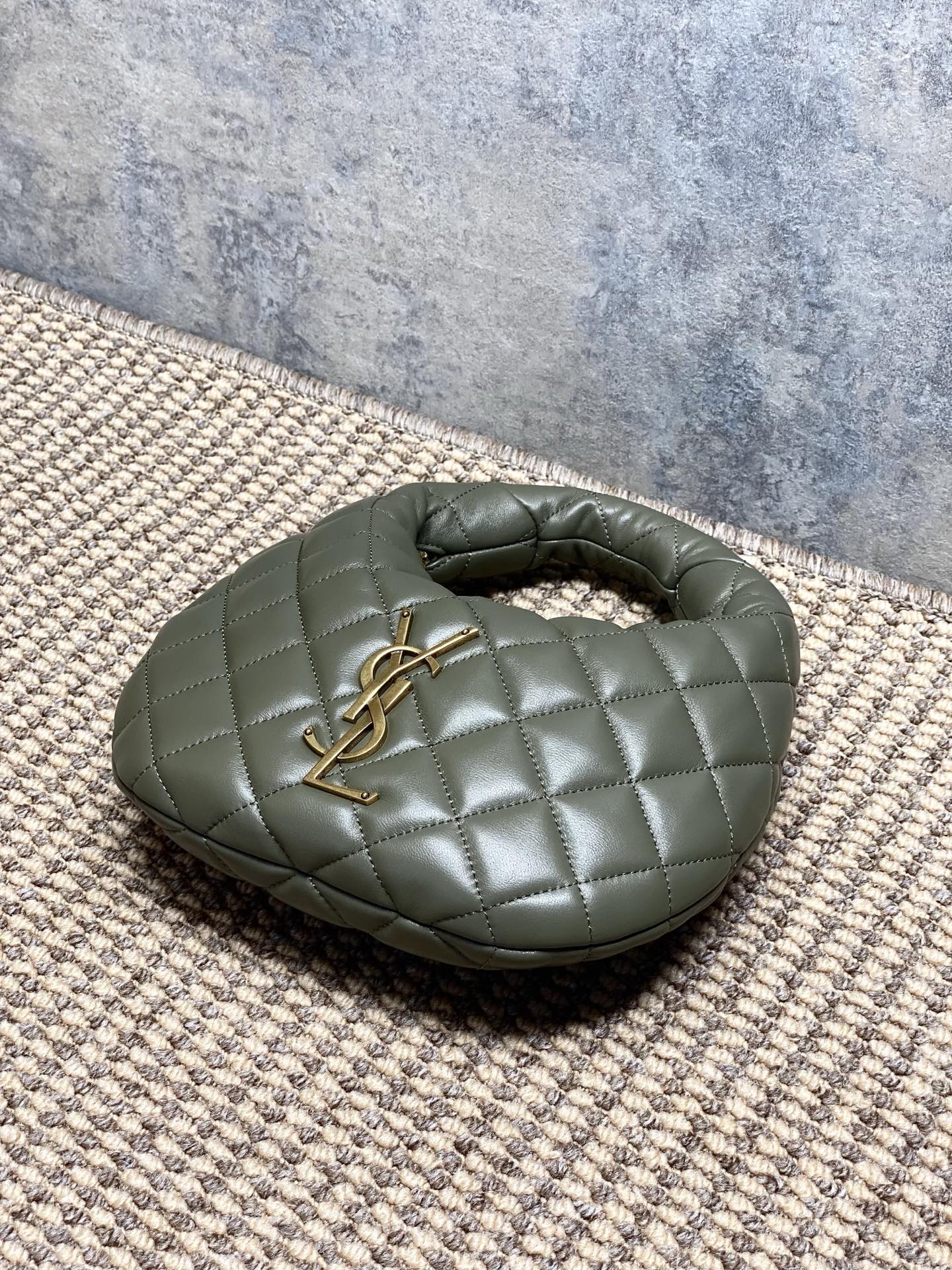 Tags: Yves Saint Laurent Baby Icare, حقيبة يد بشعار بارز, حقيبة يد جلد أصلية, حقيبة يد رمادية خضراء, حقيبة يد عصرية, حقيبة يد فاخرة
