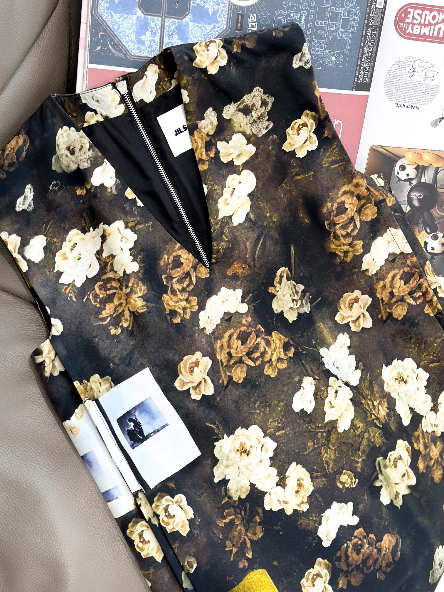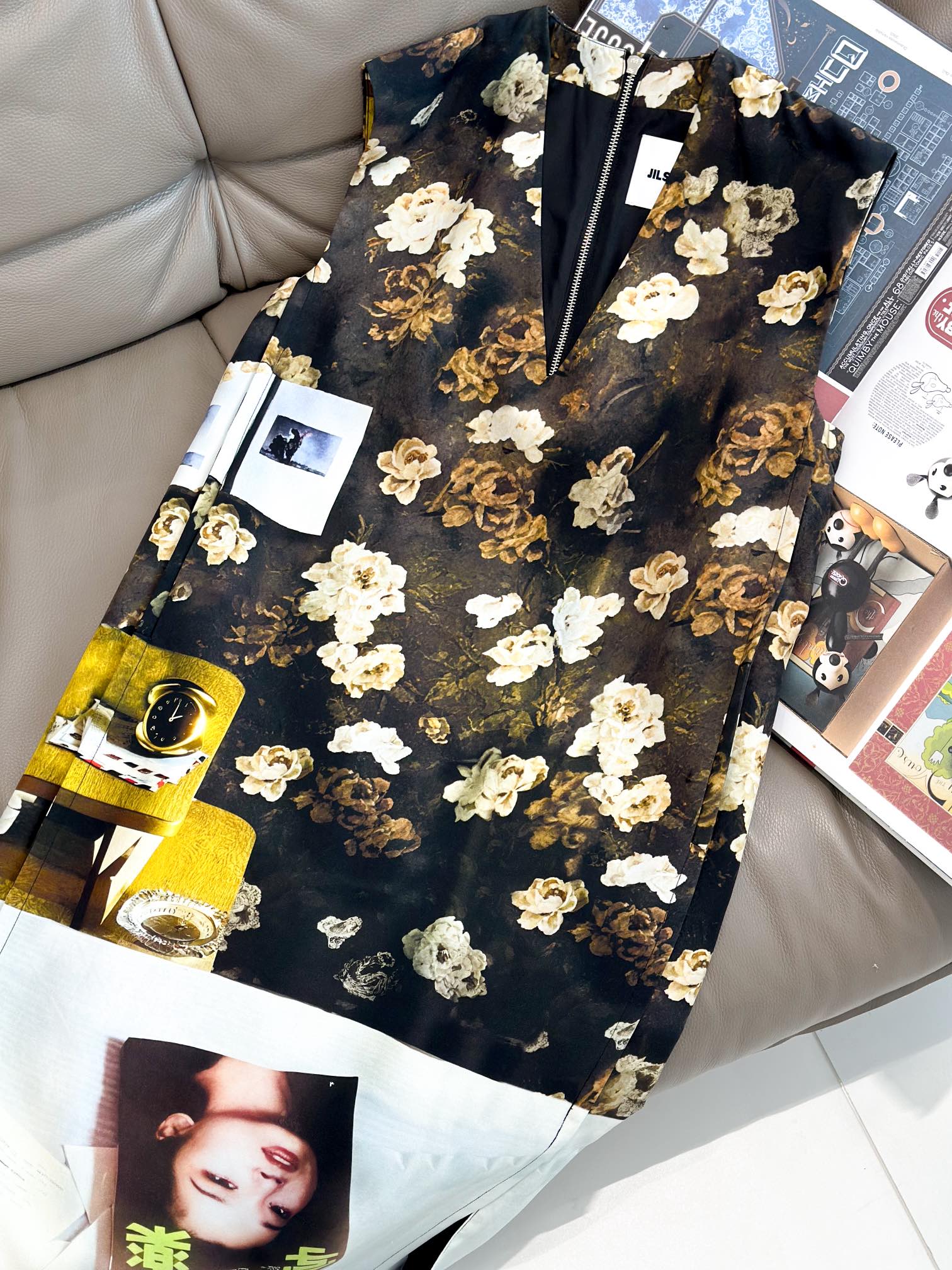 فستان ميدي بدون أكمام من Jil Sander يتميز بطبعة صور فوتوغرافية وياقة على شكل حرف V وتصميم فضفاض مع فتحة.