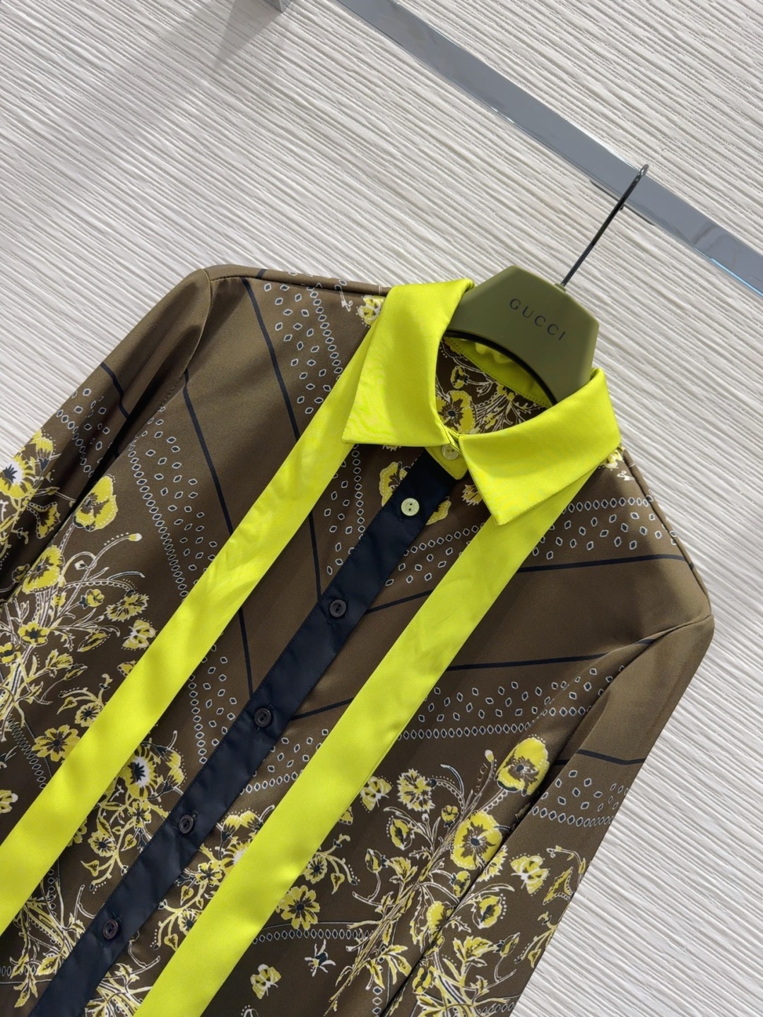 استمتعي بإطلالة فاخرة مع قميص Gucci الأنيق، يتميز بتصميم فريد وطبعة زهور أنيقة. مثالي للمرأة العصرية.