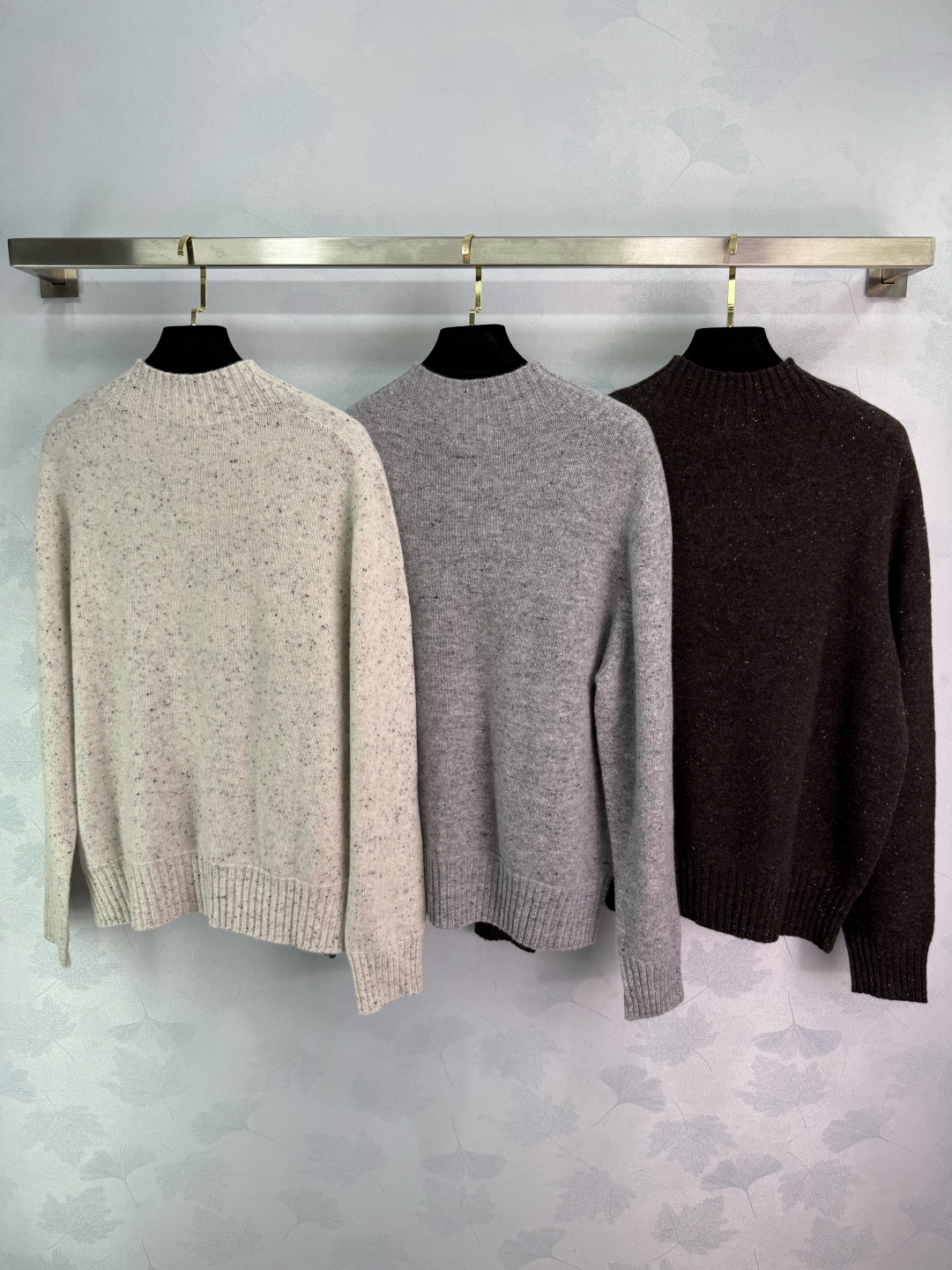 كنزة صوفية ناعمة ومريحة من مزيج الصوف مع تصميم شعار ذهبي مطرز. تصميم أنيق وبسيط يمكن ارتداؤه بمفرده أو مع طبقات.