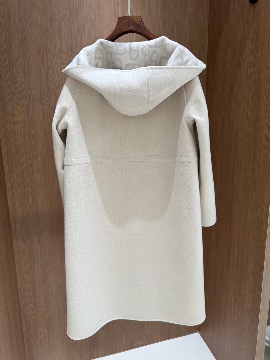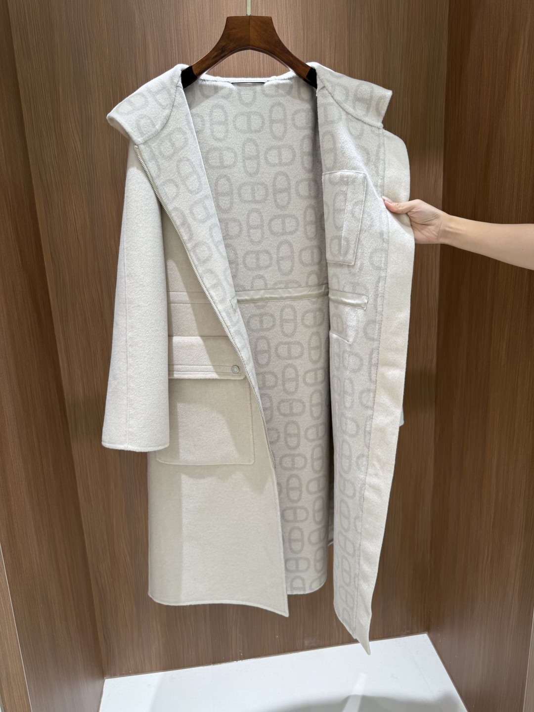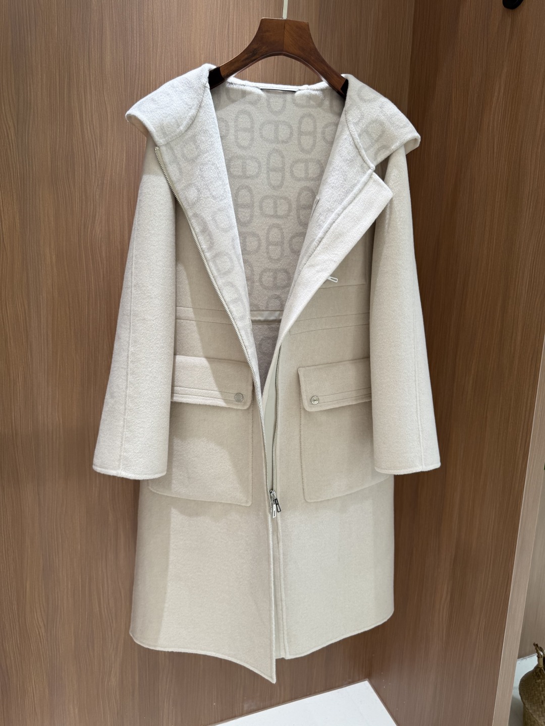 استمتعي بالفخامة مع معطف Hermès من الكشمير 100%. تصميم أنيق بغطاء للرأس وجيوب متعددة. مثالي لموسم خريف وشتاء 2025.